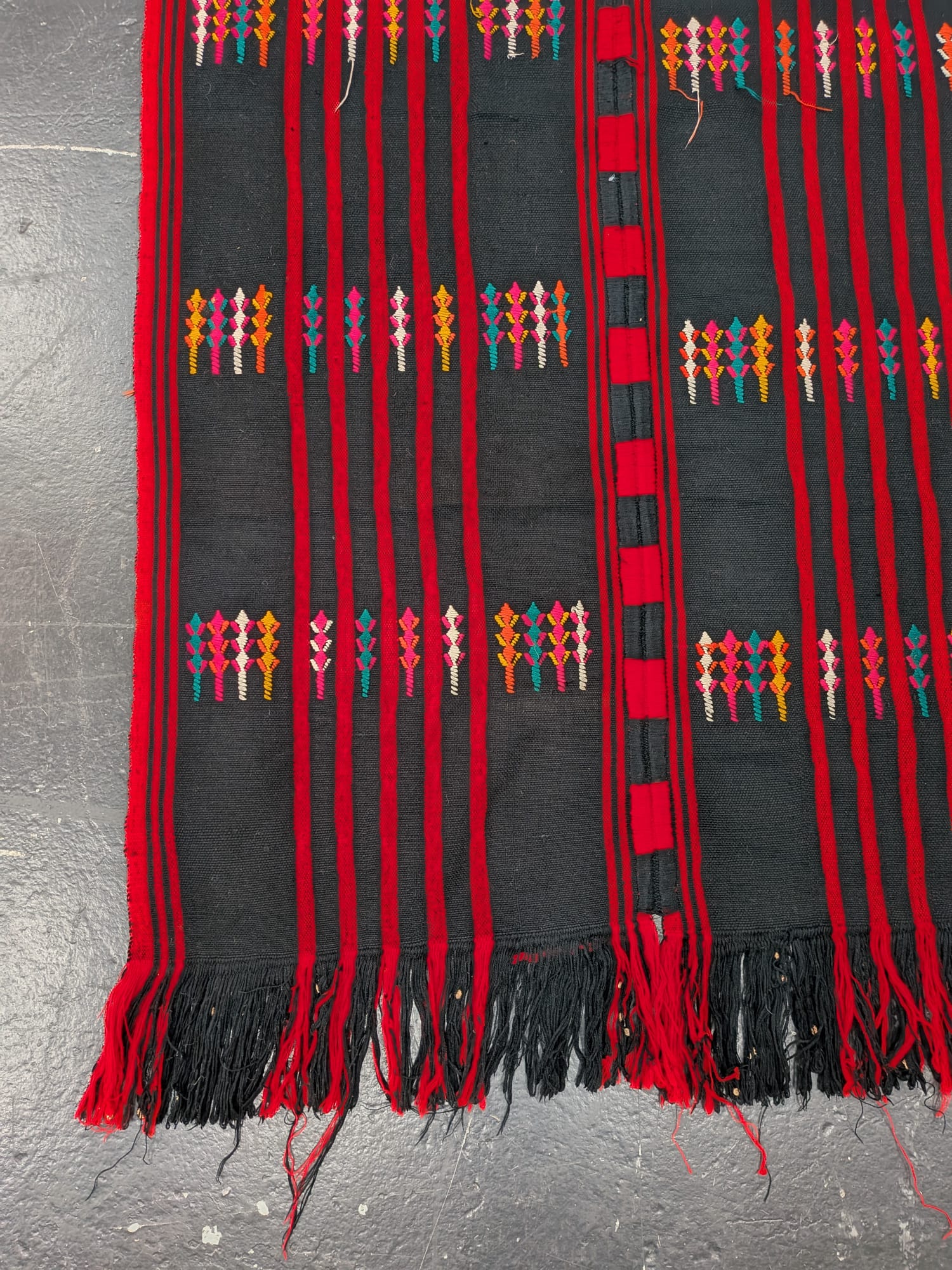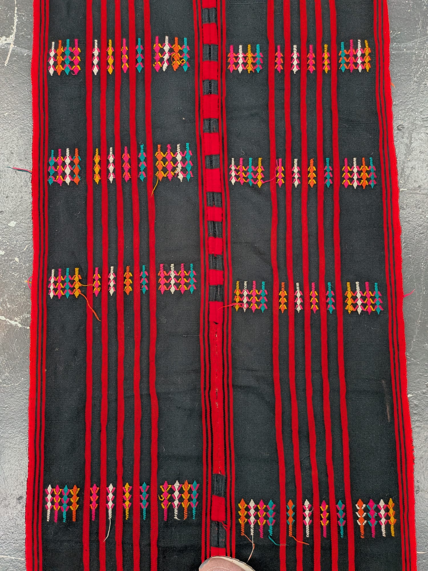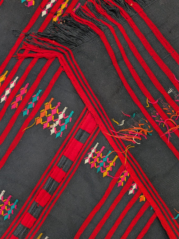 A true antique textile, handwoven in the Sahara using undyed wool and natural vegetable dyes. This blanket reflects decades of history, with natural blemishes, small tears, and signs of wear that form part of its unique story and character.