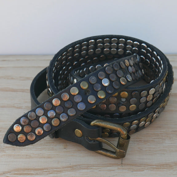 These handmade 3 row stud belts look fabulous around a dress, jeans or pair of lightweight summer trousers. High quality leather finished with a bronzed metal buckle.