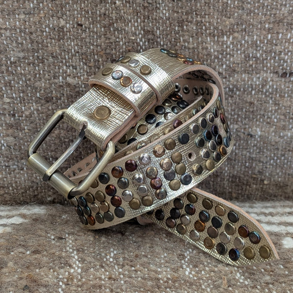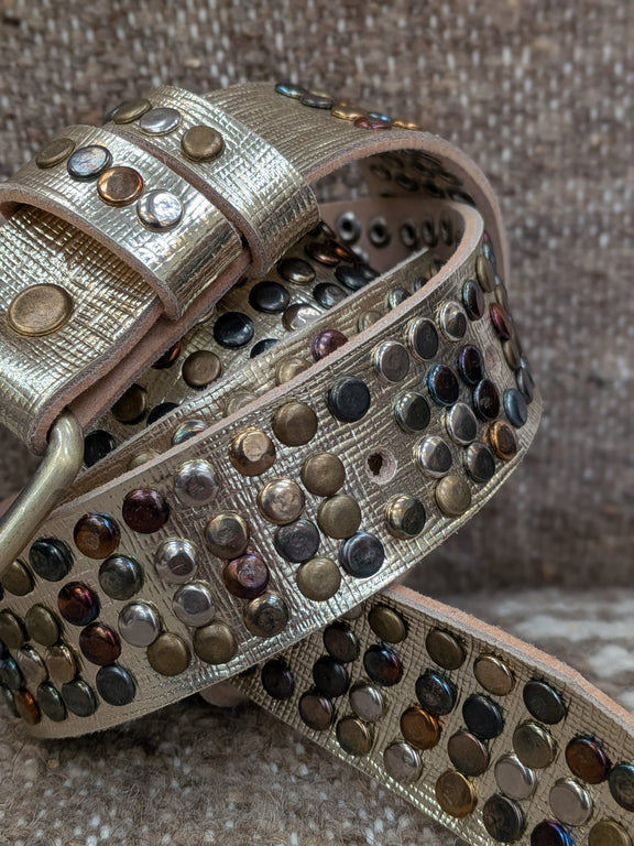 Hand punched and riveted with multi metallic studs. The leather gets softer with age.