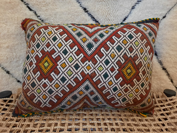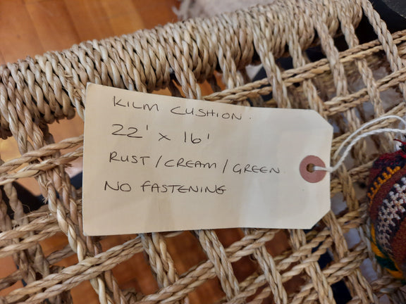 A beautiful fragment of antique wool kilim repurposed into a stunning cushion with pops of warm rusty red, tumeric, cream and green.