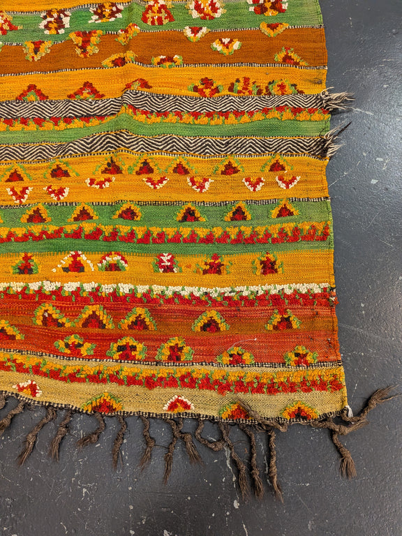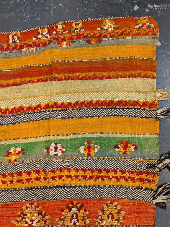 Undyed sheep’s wool in the flat weave background kilim and lines of embroidery. Saffron & mint dyes. Berber symbols depicting olive trees