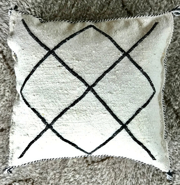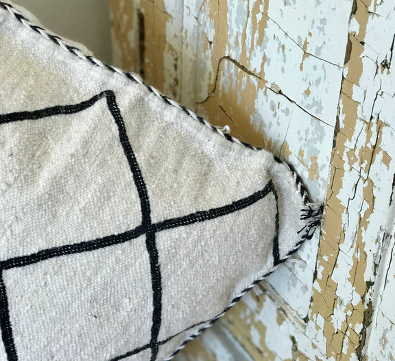 Made from fragments of Beni Ourain Kilim rugs edged with a black and white twisted braid.