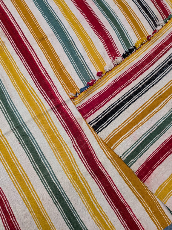A true antique textile, handwoven in the Sahara using undyed wool and natural vegetable dyes. This blanket reflects decades of history, with natural blemishes, small tears, and signs of wear that form part of its unique story and character.