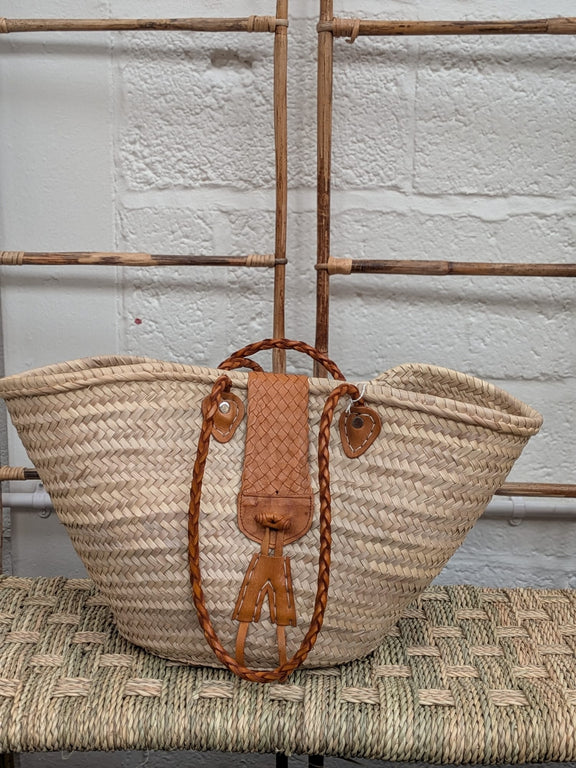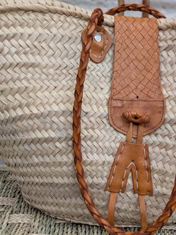 Hand woven basket with burnt orange leather handles