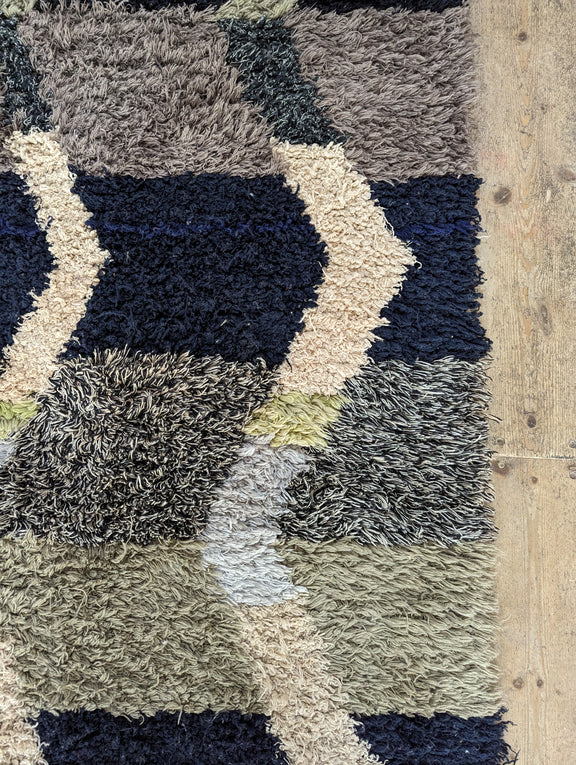 A striking wool Boucherouite rug in deep charcoal, olive green and grey.