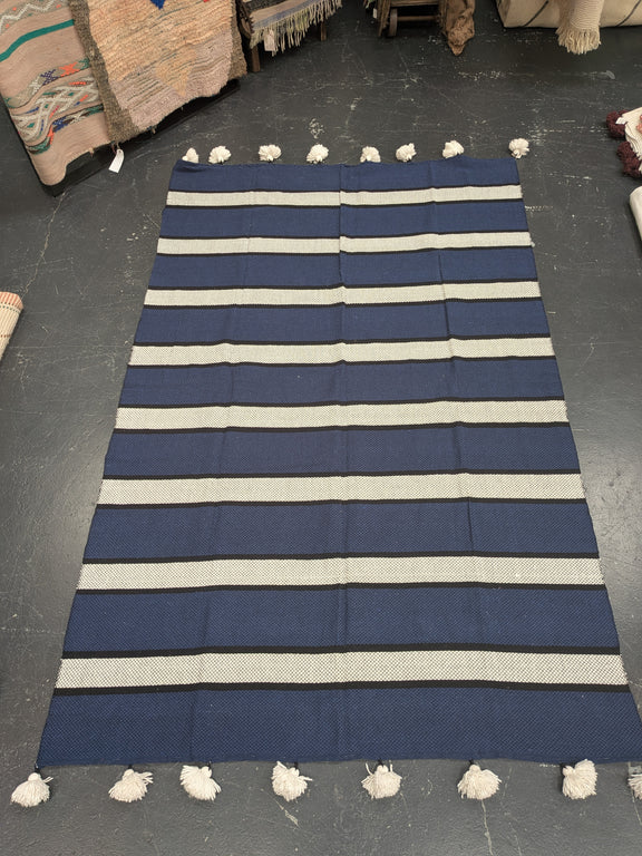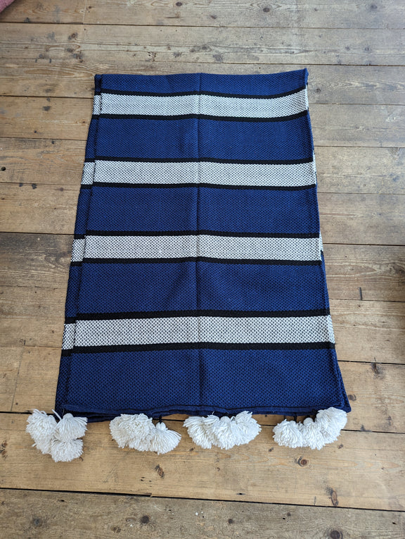 Beautiful soft wool blanket in bold navy blue, black and white stripes with lovely big, thick Pompoms. Clever double sided weaving creates a thick, waffle like effect for lightness and extra warmth.