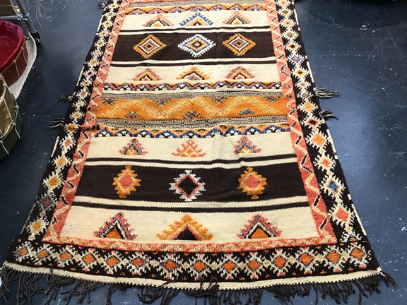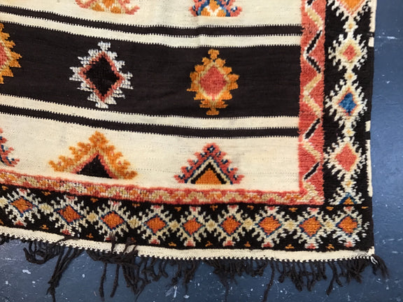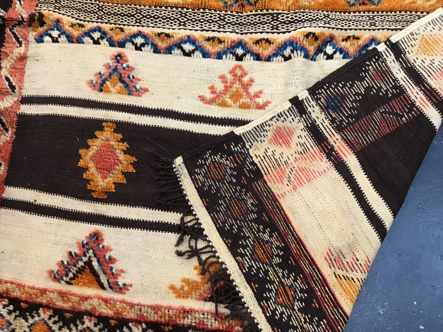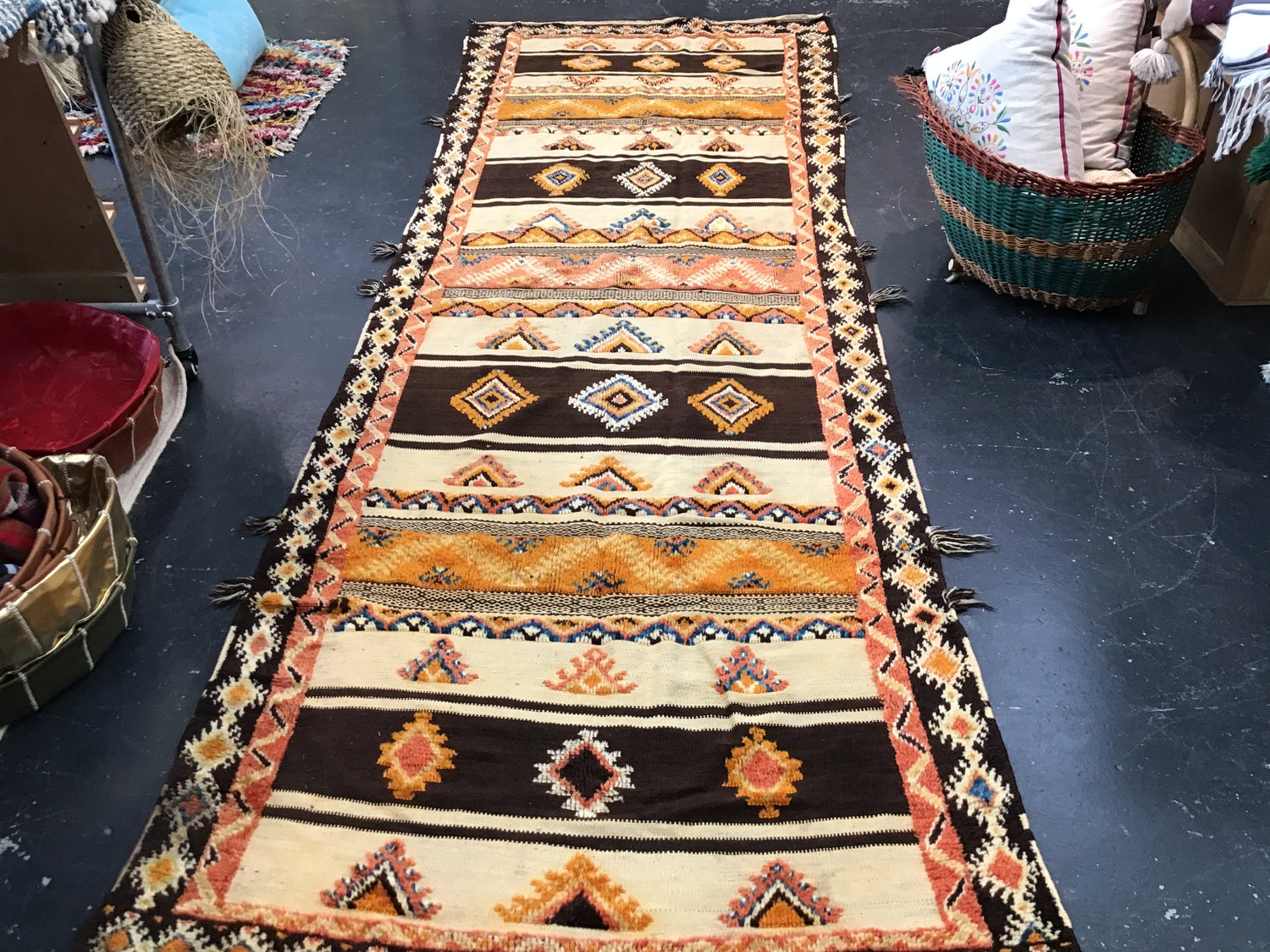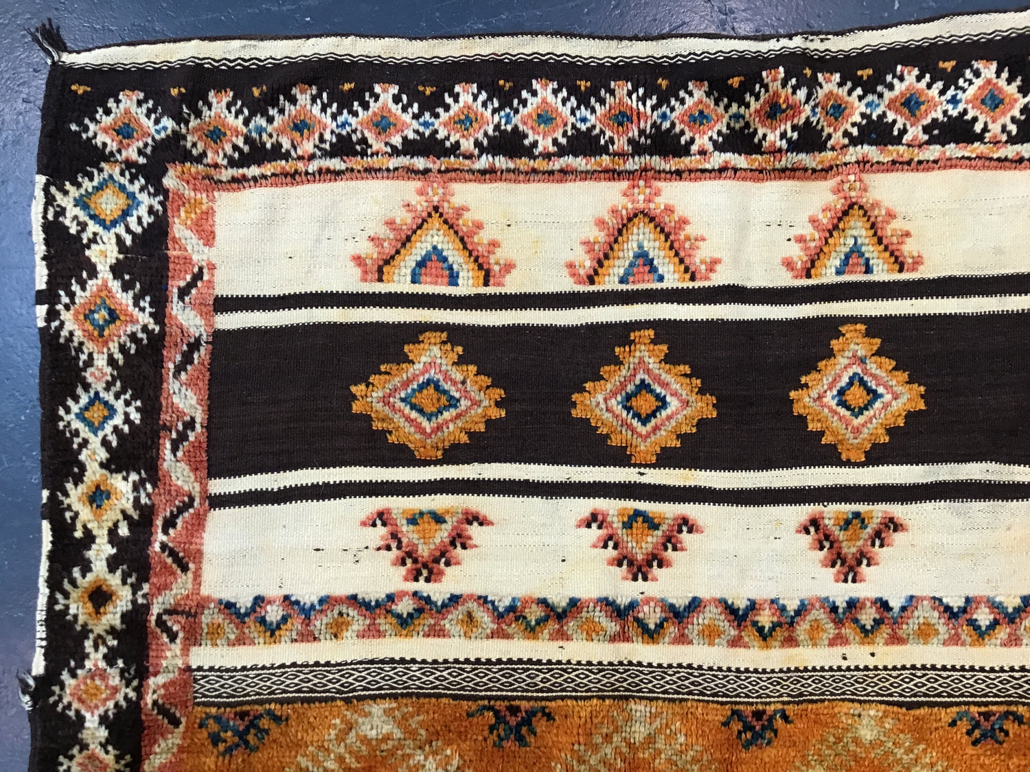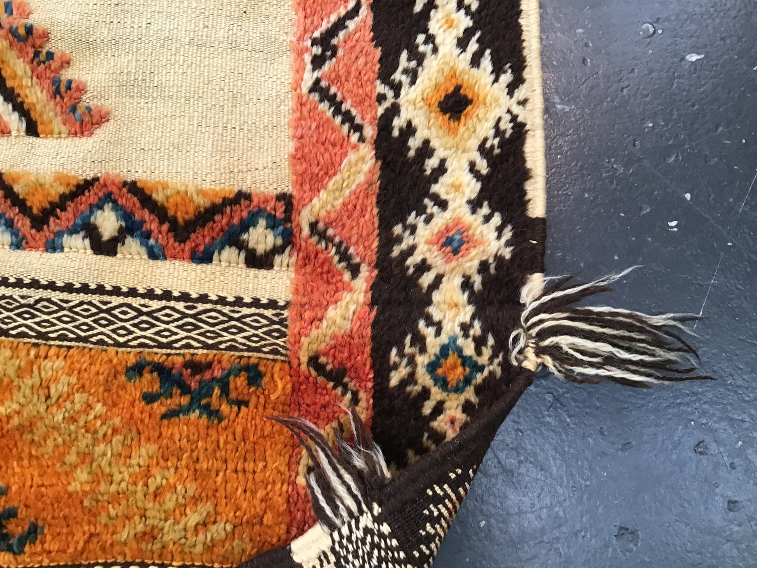 This stunning example of an antique ‘Zanafi’ rug is a joyful mix of soft, warm tones.